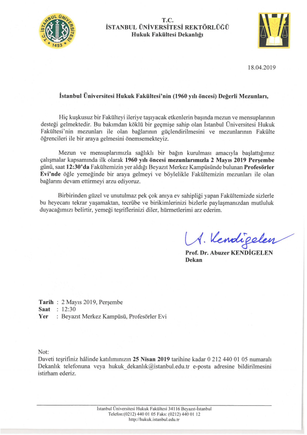 2 Mayıs 2019 Perşembe günü İstanbul Üniversitesi Profesörler Evinde saat 12:30’da düzenlenecek öğle yemeğinde 1960 yılı öncesi mezunlarımızla bir araya gelmeyi ve böylelikle Fakültemizin mezunları ile olan bağlarını devam ettirmeyi arzu ediyoruz.